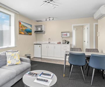 The family room provides the warmth, cleanliness and extra space your family needs for a perfect holiday experience. The room features a comfy queen size bed and two single beds, and a double roll out sofa bed. The fun, relaxed atmosphere of the Family Room makes it the perfect getaway for the entire family.