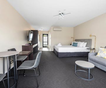 Designed for comfort and convenience, the King Studio spares no expense. Take a dip in the Jacuzzi while sipping on champagne. The quiet, spacious room features a deluxe king sized bed, and a double roll out sofa bed for a good night’s sleep and a work station area.